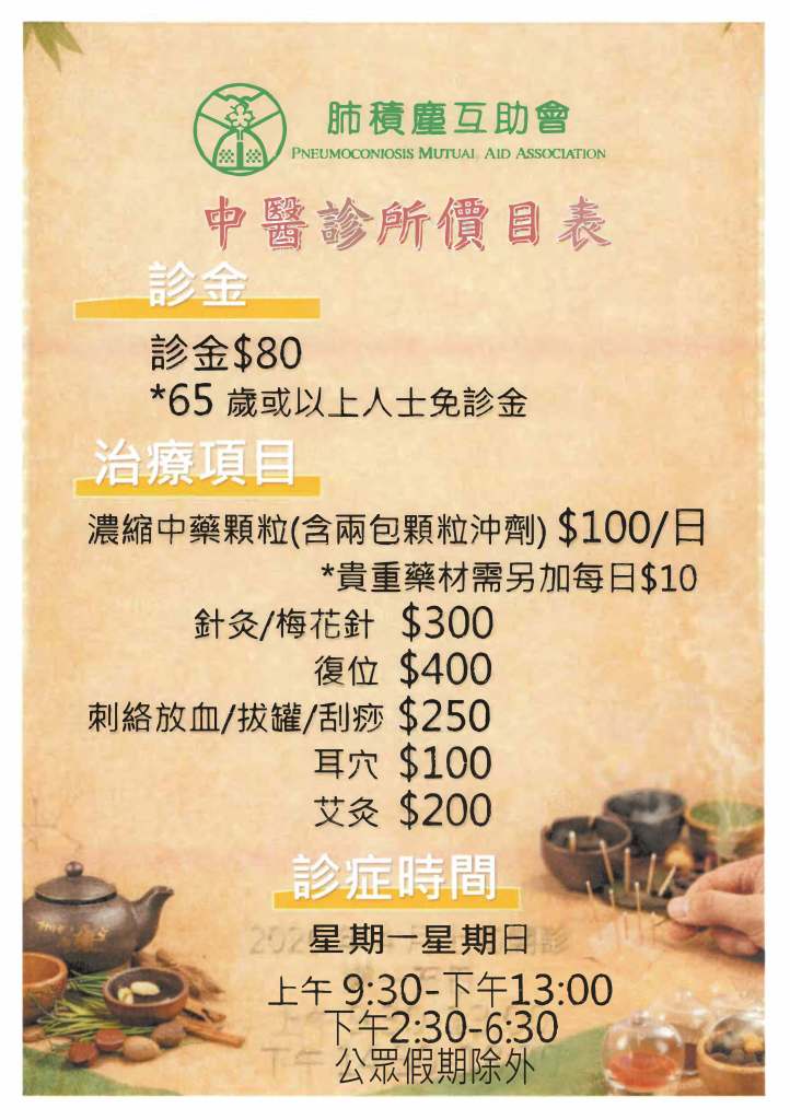 《肺積塵互助會中醫診所》 肺積塵互助會中醫診所聯絡電話:22519633傅真號碼:26609877WhatsApp: 65020790地址:香港九龍牛頭角玉蓮台第三座地下17號電郵:clinic@pmaa.org.hk 肺積塵互助會 中醫診所 價目表 分享此文: 分享到 Facebook(在新視窗中開啟) Facebook 以電子郵件將連結傳送給朋友(在新視窗中開啟) 電子郵件 喜歡 正在載入...