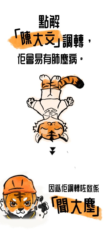 呢隻老虎叫陳大文,係大師傳嘅同行朋友。考下你點解將佢調轉,佢就會易有肺塵病呢?