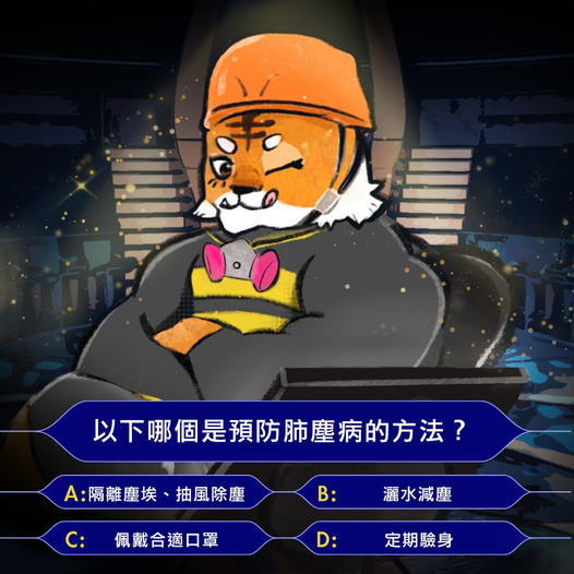 做好粉塵管理:隔離塵埃、抽風除塵、灑水減塵、佩戴合適口罩、參加基金委員會提供嘅「醫學監測計劃」,定期驗身。